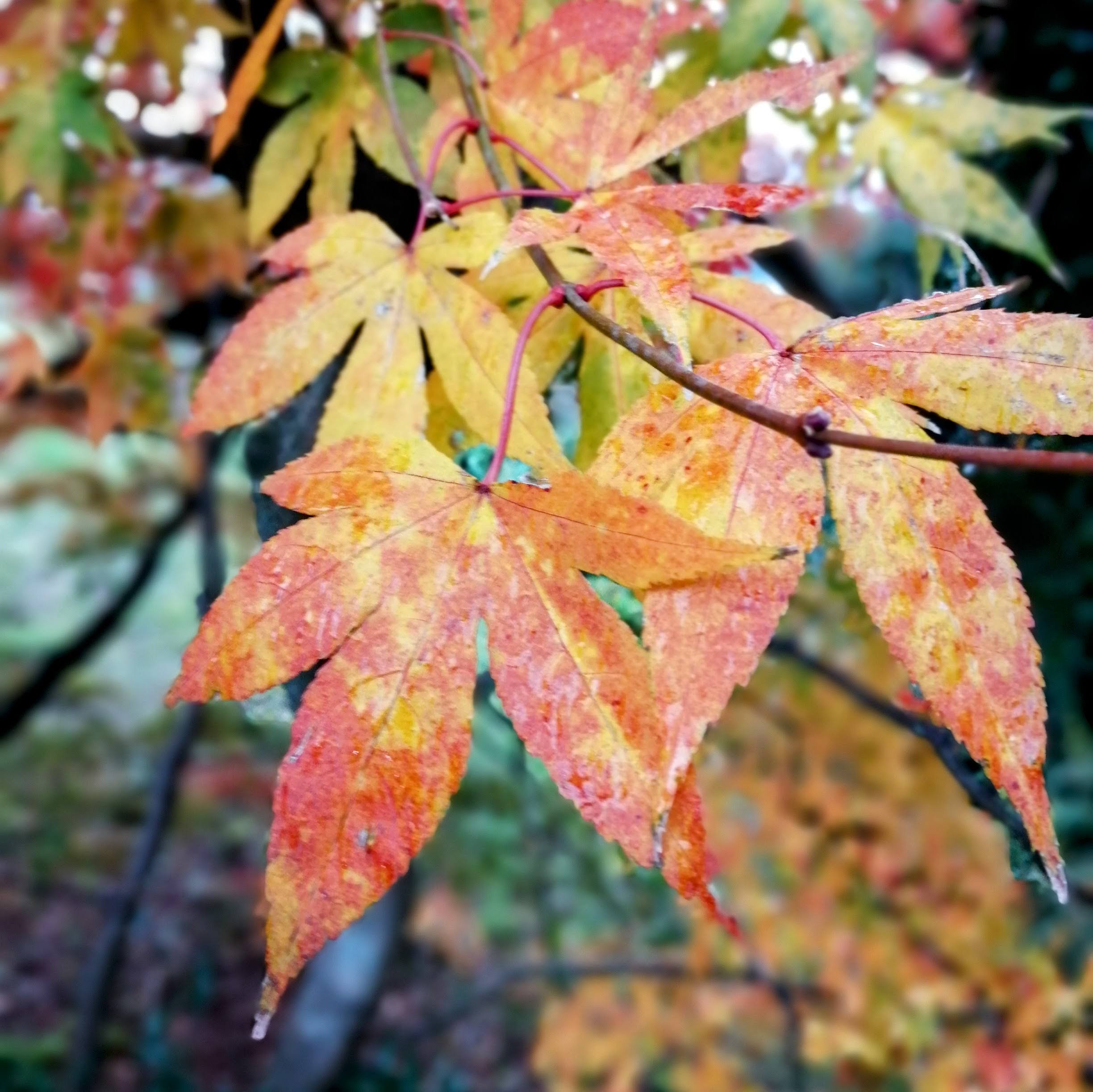 赤や黄色、オレンジ色に染まった葉が雨粒をはじく様子は、息をのむほどの美しさでした。