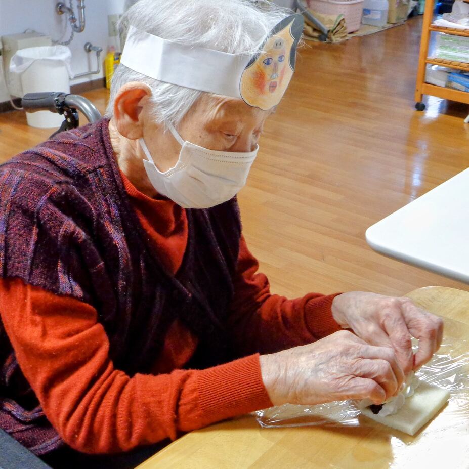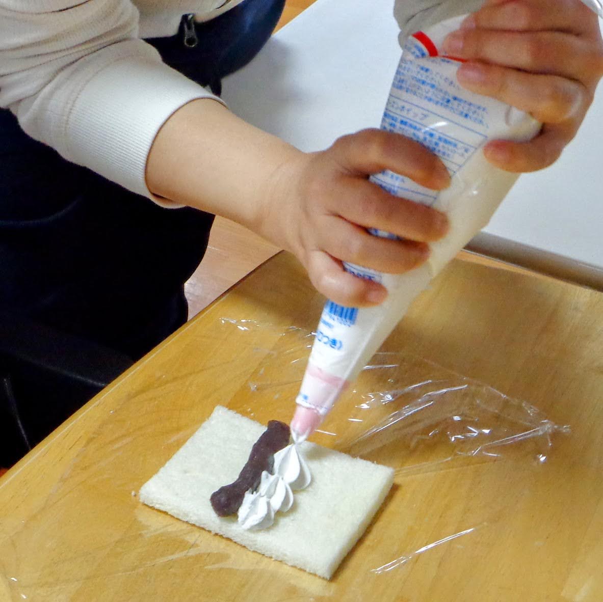 「恵方巻き風スイーツ」作り 海苔の代わりに食パンを使い、たっぷりのあんことホイップクリームをのせて、皆様ご自身で丁寧に「くるくる」と巻いていただきました。
