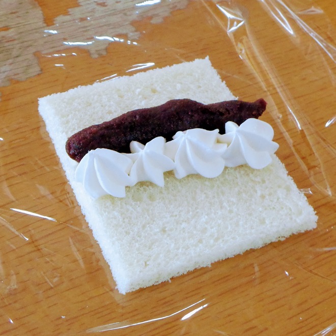 • 真っ白なパンの上に、あんことクリームを綺麗に並べました。